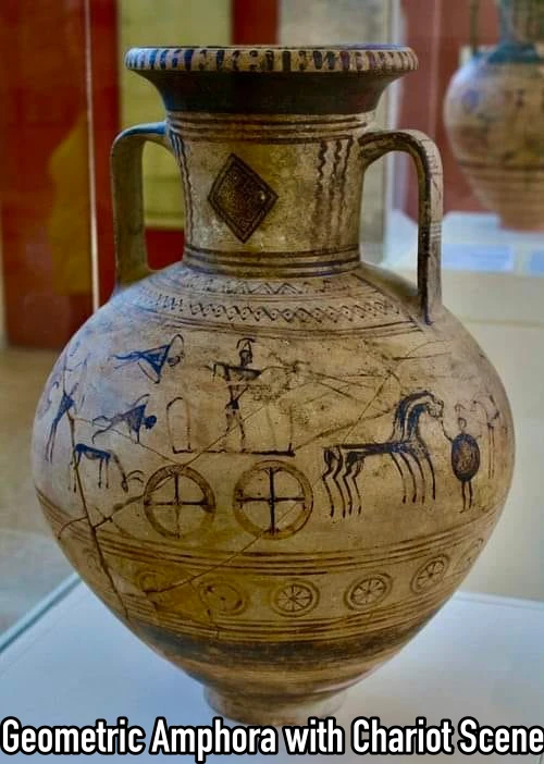 A geometric amphora with a battle scene including a chariot. 8th century BCE. (Archaeological Museum of Paros, Greece)