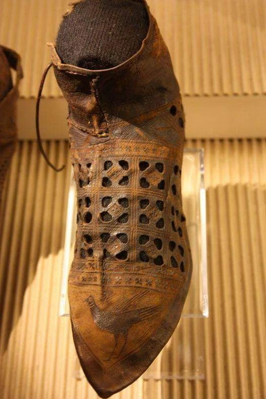 A 14th Century AD, shoe was found in Haarlem, The Netherlands. The side laced shoe with decorative perforations depicting a bird was probably worn over a brightly colored hose, so it would have been quite eye catching combination.