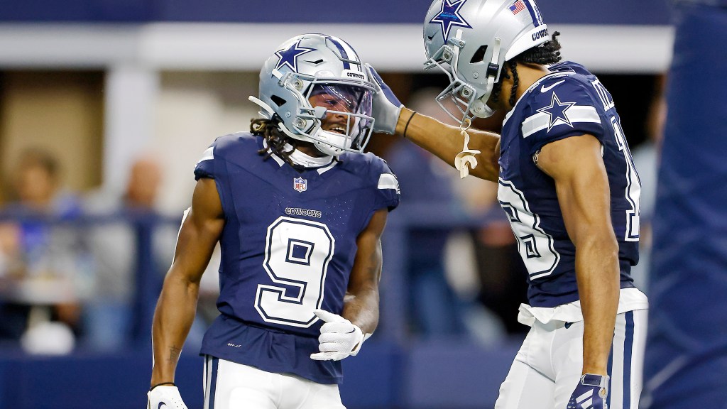 Jun 4, 2024; Frisco, TX, USA; Dallas Cowboys quarterback Cooper Rush (10) and quarterback Dak Prescott (4) and quarterback Trey Lance (19) talk during practice…